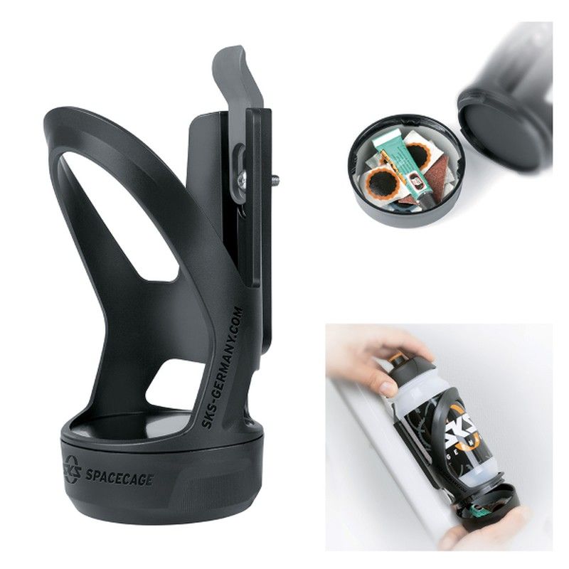 Porta bidón spacecage, c/compartimento porta objetos, para kit parchesllaves, dinero. Cierre bayoneta, color negro
